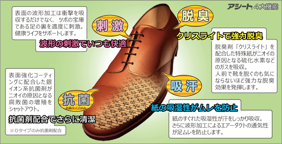 硬めな履き心地です。脱臭剤「クリスライト」を配合した特殊紙がニオイの原因となる硫化水素を吸収します。紙なので、靴の中の水分を吸い取ります。紙の表面に銀イオン系抗菌剤を塗布加工しています。