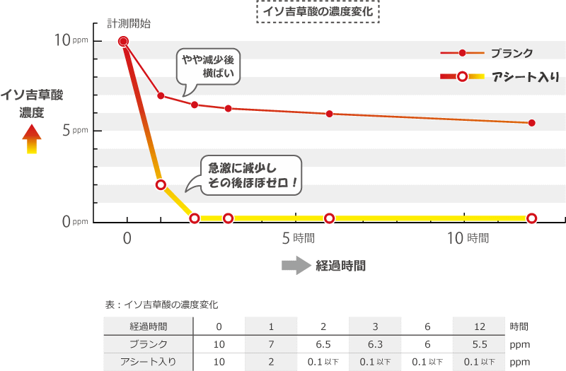イソ吉草酸(靴下や足の裏のニオイ)の10ppm標準ガスをテドラーバッグ(10L)に封入し、アシート入りとなし(ブランク品)の2サンプルを準備。2つのサンプルのイソ吉草酸濃度の経時変化をガスクロマトグラフ法にて測定。